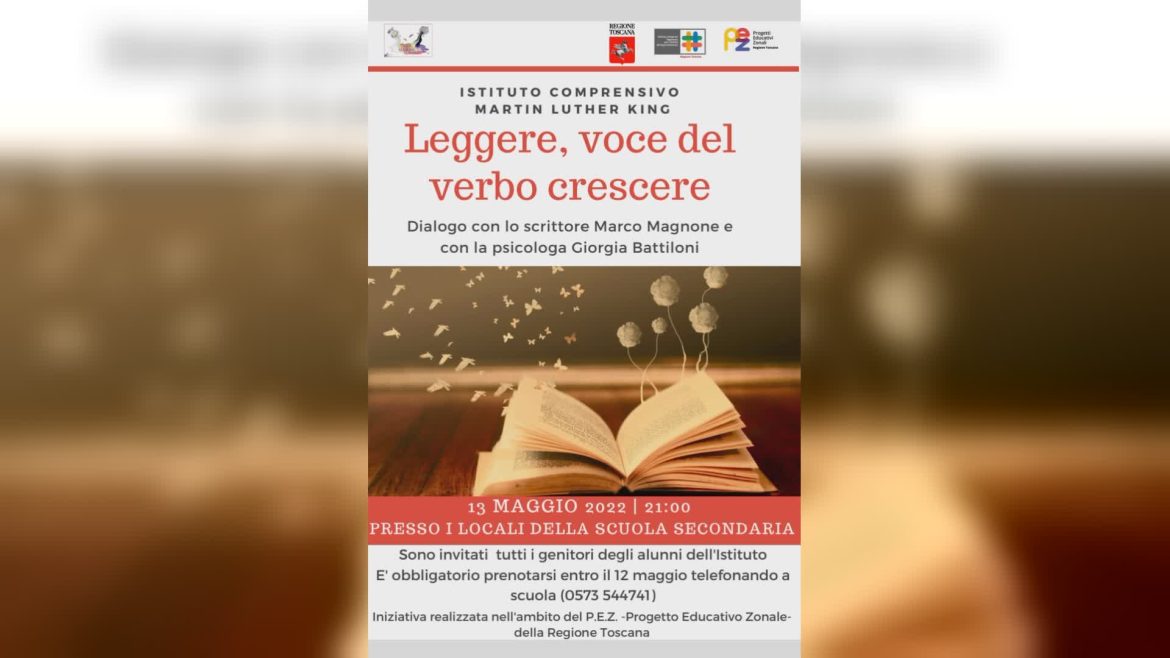 Si parte giovedì 12 con Magnone (autore assai conosciuto nell’ambito dell’editoria per ragazzi) che si incontra con gli alunni del locale “circolo di lettura”. Venerdì laboratori nelle classi. Sabato 14 si svolge la premiazione del concorso di scrittura “Siamo fatti di storie” mentre venerdì 13 i locali della scuola ospitano un incontro (ore 21) aperto a chiunque sia interessato sulla importanza della lettura e della creatività. “Leggere, voce del verbo crescere”, questo il titolo, con un dialogo tra Magnone e la psicologa Giorgia Battistini. Prenotazioni entro questo giovedì 12 telefonando alla segretaria della scuola (0573 544741).