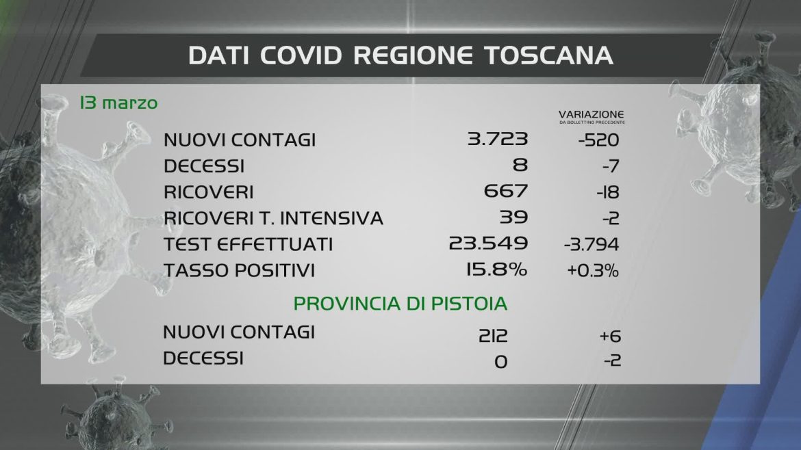 Coronavirus, Toscana: sono 3.723 i nuovi positivi (-520 rispetto al bollettino precedente); 8 decessi (-7). I ricoveri in isolamento sono 667 (-18), i malati in terapia intensiva 39 (-2). Eseguiti 23.549 test (-3.794); il tasso dei positivi è del 15.8% (+0.3%); il 53.2% sulle prime diagnosi (-5.1%).