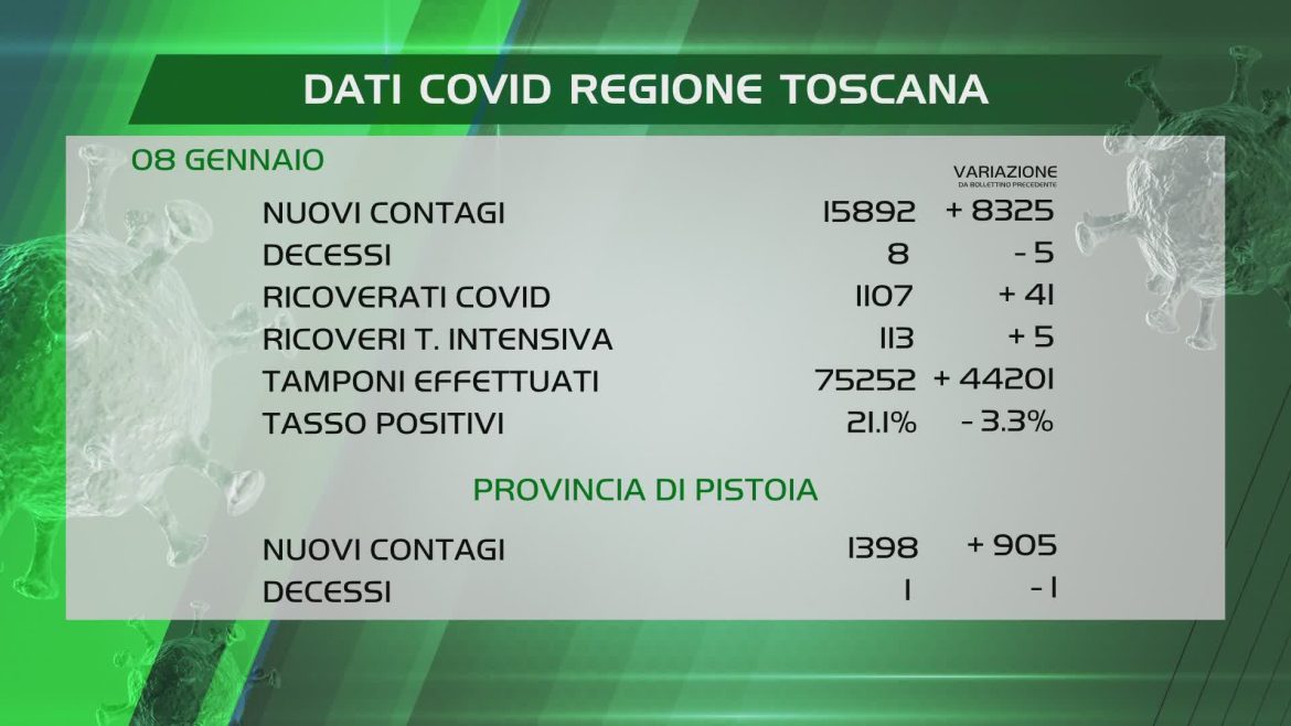 Sono 15892 i nuovi positivi al covid in Toscana, a rendelo noto è la Regione nel bollettino di oggi, sabato 8 gennaio (+ 8325 rispetto al bollettino precedente); 8 i decessi (-5). Le persone ricoverate nei posti letto dedicati ai pazienti Covid oggi sono complessivamente 1.107 (41 in più rispetto a ieri), 113 in terapia intensiva (5 in più rispetto a ieri). Sono stati eseguiti 75252 test (+44201); il tasso dei positivi è del 21,1% (- 3,3%); il 79,7% sulle prime diagnosi (+14,7%).