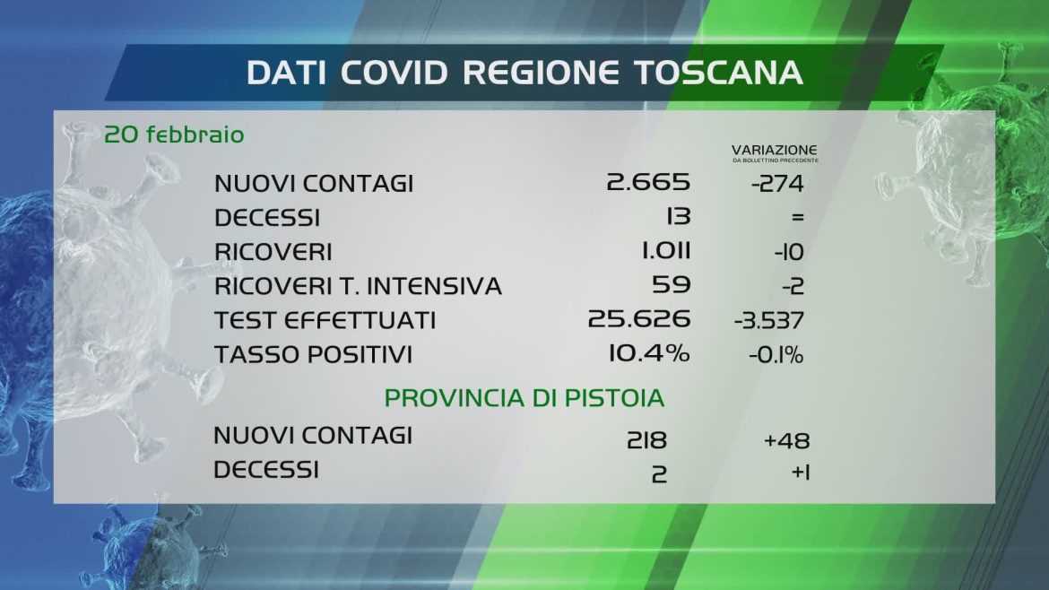 Coronavirus, Toscana: sono 2.665 i nuovi positivi (-385 rispetto al bollettino precedente); 13 decessi (stabile). I ricoveri in isolamento sono 1.011 (-10), malati in terapia intensiva 59 (-2). Eseguiti 25.626 test (-3.537); il tasso dei positivi è del 10.4% (-0.1%); il 48.2% sulle prime diagnosi (-7.1%).