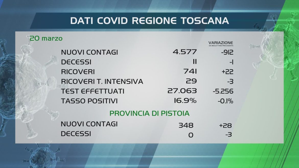 Coronavirus, Toscana: sono 4.577 i nuovi positivi (-912 rispetto al bollettino precedente); 11 decessi (-1). I ricoveri in isolamento sono 741 (+22), i malati in terapia intensiva 29 (-3). Eseguiti 27.063 test (-5.256); il tasso dei positivi è del 16.9% (-0.1%); il 57.9% sulle prime diagnosi (-2.1%).
