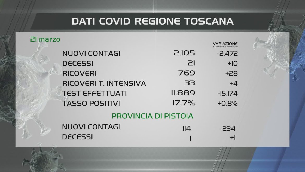 Coronavirus, Toscana: sono 2.105 i nuovi positivi (-2.472 rispetto al bollettino precedente); 21 decessi (+10). I ricoveri in isolamento sono 769 (+28), i malati in terapia intensiva 33 (+4). Eseguiti 11.889 test (-15.174); il tasso dei positivi è del 17.7% (+0.8%); il 51.9% sulle prime diagnosi (-6.0%).
