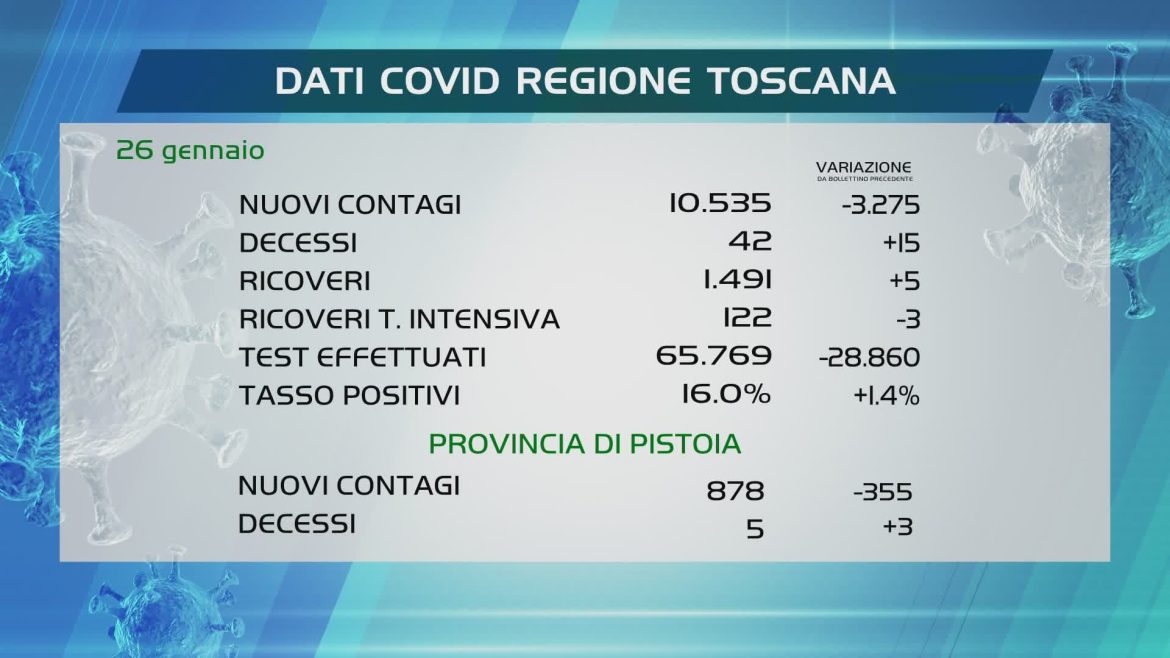 Coronavirus, Toscana: sono 10.535 i nuovi positivi (-3.275 rispetto al bollettino precedente); 42 decessi (+15). I ricoveri in isolamento sono 1.491 (+5), 122 malati in terapia intensiva (-3). Eseguiti 65.769 test (-28.860); il tasso dei positivi è del 16.0% (+1.4%); il 73.8% sulle prime diagnosi (-3.5%). Dati 26 gennaio