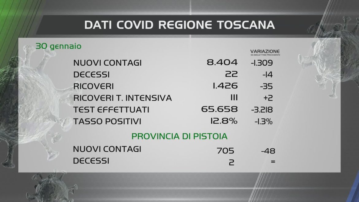 Coronavirus, Toscana: sono 8.404 i nuovi positivi (-1.309 rispetto al bollettino precedente); 22 decessi (-14). I ricoveri in isolamento sono 1.426 (-35), 111 malati in terapia intensiva (+2). Eseguiti 65.658 test (-3.218); il tasso dei positivi è del 12.8% (-1.3%); il 66.7% sulle prime diagnosi (-3.6%). Dati 30 gennaio