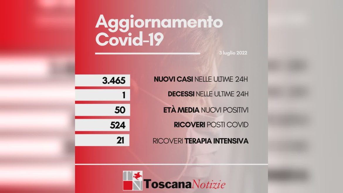 Sono 3.465 i nuovi positivi al covid in Toscana ( – 1062 rispetto al bollettino precedente); si registra un decesso (- 3). Sono i dati riportati dal bollettino regionale di oggi, domenica 3 luglio. L'età merdia dei nuovi positivi è di 50 anni.