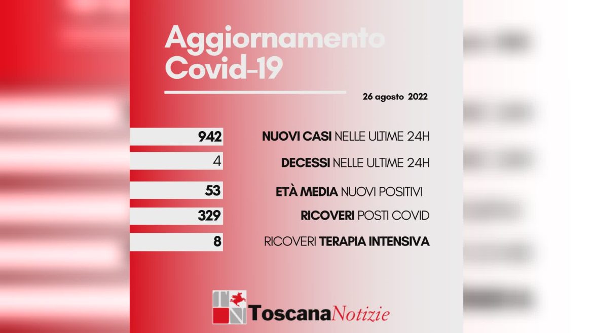 Di seguito i casi di positività sul territorio con la variazione rispetto a ieri (202 confermati con tampone molecolare e 740 da test rapido antigenico). Sono 375.364 i casi complessivi ad oggi a Firenze (177 in più rispetto a ieri), 92.121 a Prato (56 in più), 108.140 a Pistoia (71 in più), 68.668 a Massa (92 in più), 146.459 a Lucca (109 in più), 159.156 a Pisa (110 in più), 123.979 a Livorno (84 in più), 124.111 ad Arezzo (108 in più), 98.341 a Siena (67 in più), 75.196 a Grosseto (68 in più). Sono 555 i casi positivi notificati in Toscana, ma residenti in altre regioni.