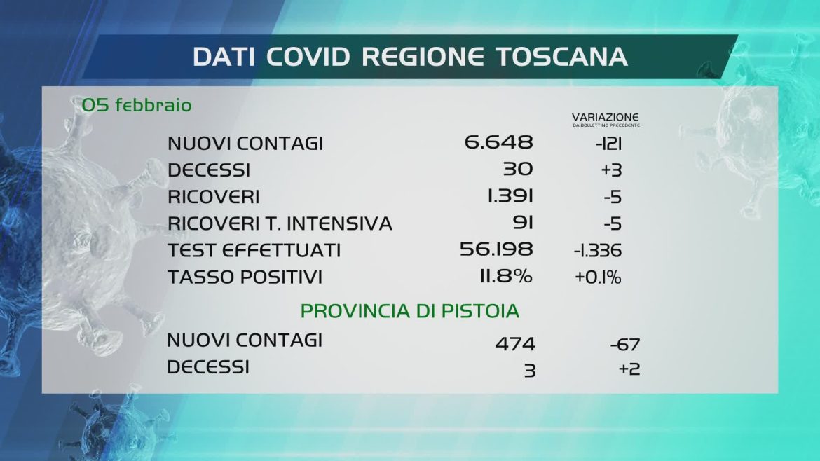 Coronavirus, Toscana: sono 6.648 i nuovi positivi (-121 rispetto al bollettino precedente); 30 decessi (+3). I ricoveri in isolamento sono 1.391 (-15), malati in terapia intensiva 91 (-5). Eseguiti 56.198 test (-1.336); il tasso dei positivi è del 11.8% (+0.1%); il 68.6% sulle prime diagnosi (-0.4%).