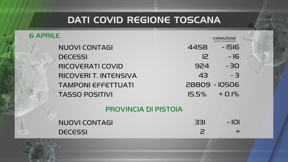 Sono 4458 i nuovi positivi al covid in Toscana (-1516 rispetto al bollettino precedente); 12 i decessi (-16).