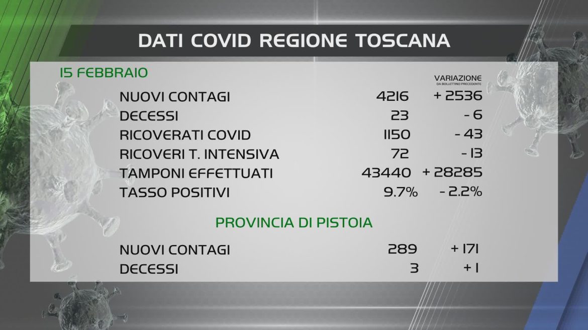 Coronavirus, Toscana: sono 4.216 i nuovi positivi (+2.536 rispetto al bollettino precedente); 23 decessi (-6). I ricoveri in isolamento sono 1.150 (-43), malati in terapia intensiva 72 (-13). Eseguiti 43.440 test (+28.285); il tasso dei positivi è del 9.7% (-2.2%); il 58.7% sulle prime diagnosi (+6.0%). Dati 15 febbraio