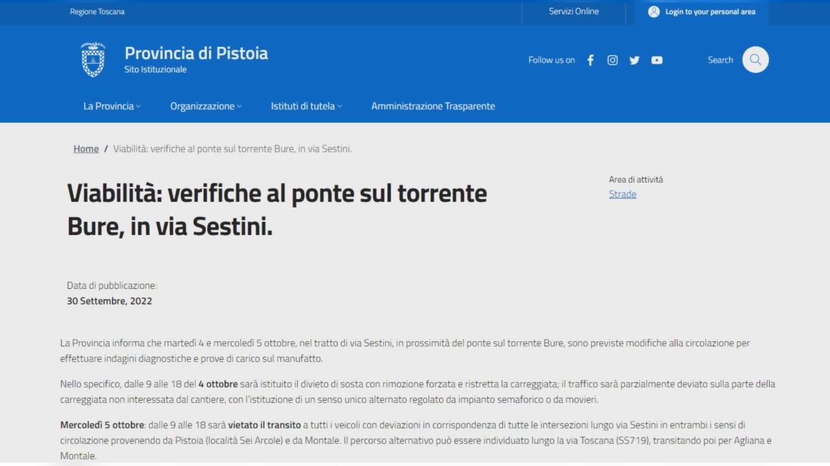 La Provincia di Pistoia informa che martedì 4 e mercoledì 5 ottobre, nel tratto di via Sestini, in prossimità del ponte sul torrente Bure, sono previste modifiche alla circolazione per effettuare indagini diagnostiche e prove di carico sul manufatto.