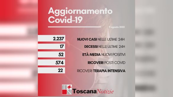Di seguito i casi di positività sul territorio con la variazione rispetto a ieri (308 confermati con tampone molecolare e 1.929 da test rapido antigenico). Sono 372.068 i casi complessivi ad oggi a Firenze (432 in più rispetto a ieri), 91.193 a Prato (85 in più), 106.914 a Pistoia (153 in più), 67.134 a Massa (173 in più), 144.110 a Lucca (323 in più), 157.076 a Pisa (293 in più), 121.968 a Livorno (267 in più), 122.573 ad Arezzo (203 in più), 97.168 a Siena (142 in più), 73.779 a Grosseto (166 in più). Sono 555 i casi positivi notificati in Toscana, ma residenti in altre regioni.