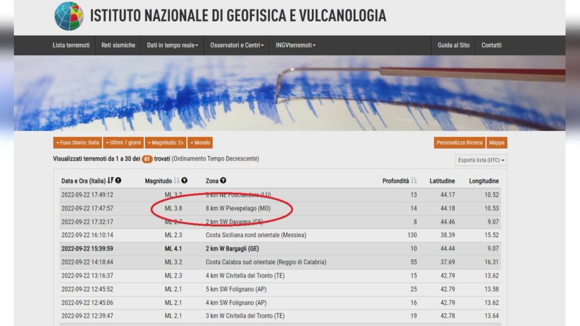 Gli strumenti, spiega l'Istituto Nazionale di Geofisica e Vulcanologia, hanno rilevato una scossa alle 17.47, con magnitudo 3.8, a circa otto chilometri ad ovest dall'abitato di Pievepelago, ad una profondità di 14 chilometri.